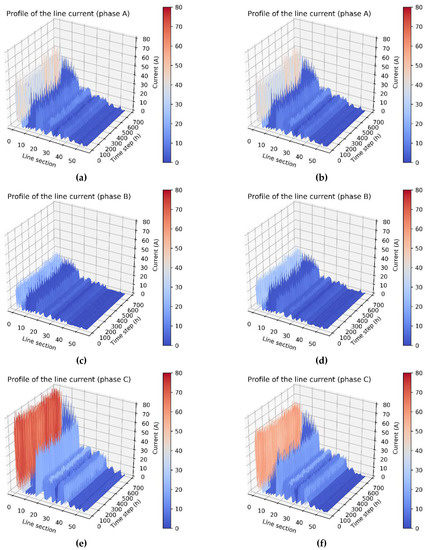 Figure 14 depicts the simulation results of the current of each phase in each line section before and after rephasing. The magnitudes of the line current of phases A, B, and C in each line section from the feeder at the secondary side of main transformer in distribution substation to the feeder end of a radial type distribution feeder show a decreasing distribution. In other words, the smaller the distance from the distribution substation, the larger the current becomes. In this study, the loading from heavy to light was as follows: phase C > phase A > phase B, and this corresponded to the magnitude of the line current in each phase. The simulation results shown in Figure 14b,d,f show that the current unbalance of each phase after optimization was better than those shown in Figure 14a,c,d, respectively, before optimization.