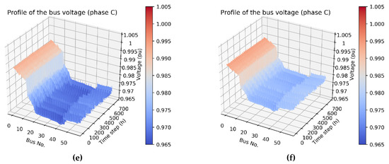 Bus voltage profiles: (a) phase A: before rephasing, (b) phase A: after rephasing, (c) phase B: before rephasing, (d) phase B: after rephasing, (e) phase C: before rephasing, and (f) phase C: after rephasing.