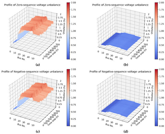 Zero- and negative-sequence voltage unbalance factors: (a) Zero-sequence: before rephasing, (b) Zero-sequence: after rephasing, (c) Negative-sequence: before rephasing, and (d) Negative-sequence: after rephasing.