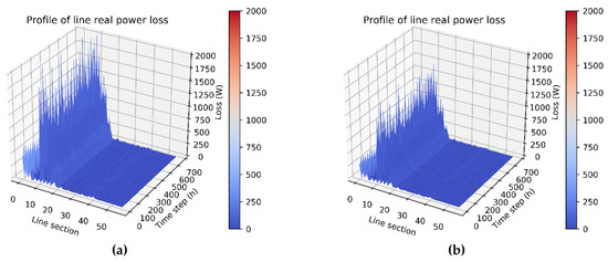 As stated earlier, the higher the neutral current, the greater the three-phase unbalance, which then causes extra power loss. Figure 17 depicts the simulation results of the total three-phase power loss in each line section before and after rephasing. The numerical value in each line section reflects the magnitude of the current and the three-phase unbalance ratio. The simulation results in Figure 17b show that the overall power loss after optimization was smaller than that before optimization, as shown in Figure 17a.