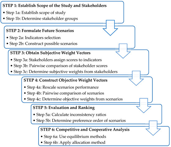 The objective of utilising MCDA is to evaluate—according to stakeholders’ preferences—which is the best from a set of hypothetically built, by the researcher, future CE scenarios of MSWM in cities. While there are many ways to develop scenarios, the four Urban Futures scenario archetypes, which are themselves based on four of the six scenarios developed by the Global Scenario Group (their two scenarios involving societal breakdown were considered irrelevant to this exercise), are used because of their ability to provide diverse stakeholder engagement in futures; for more details refer to [35,36,37]. They have been re-interpreted to show the thinking for MSWM: