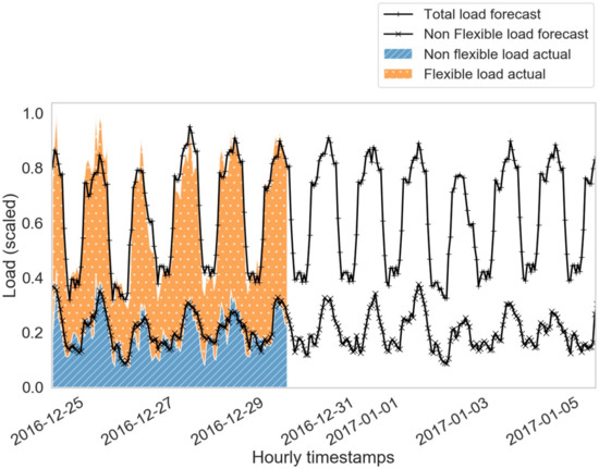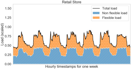 Removal of the outliers leave gaps. Single timestamp gaps are filled by imputing with the mean of preceding and succeeding values. In the case of two or more consecutive gaps, the data samples are removed from the dataset. After dealing with the data gaps, the meter data are scaled using the maximum rated building load. This is primarily done for the purpose of data anonymisation. A one week snapshot of these scaled data are shown in Figure 1. It can be seen that the flexible loads (air conditioners and chillers) constitute about 25–40% of the maximum rated building load. The other loads are assumed to be non-flexible for the purpose of providing DR.