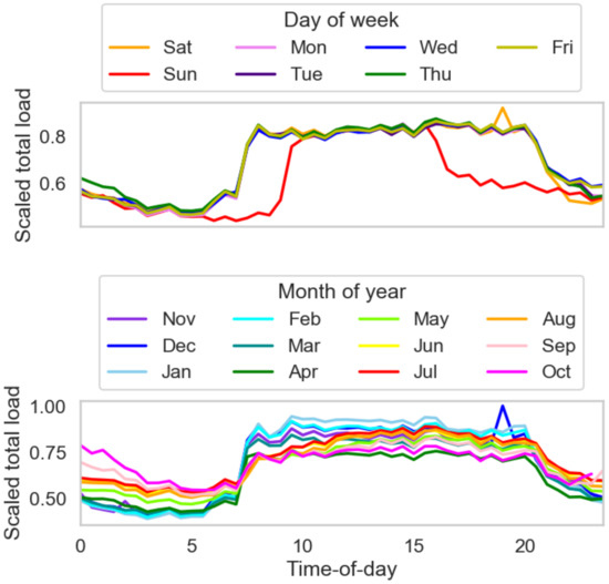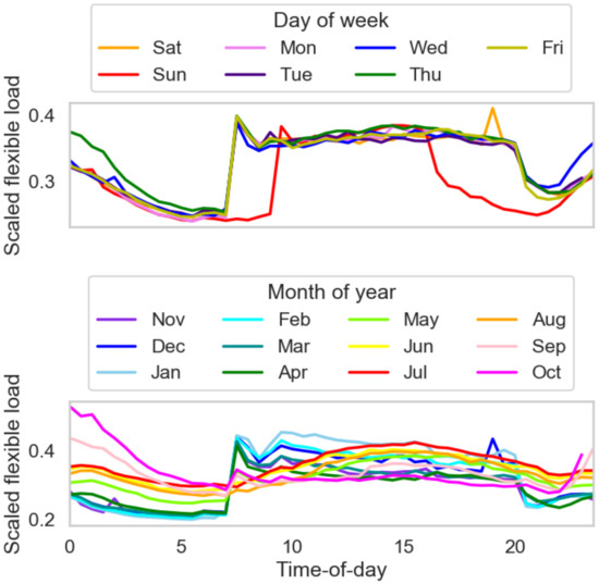 In order to understand the temporal influence on the energy consumption patterns in the retail building, load profiling is performed on the collected smart meter data. The time-of-day variations for the scaled total and flexible loads across day-of-week and month-of-year are shown in Figure 2 and Figure 3, respectively. The plotted lines represent annual mean values for day-of-week and monthly mean values for month-of-year.