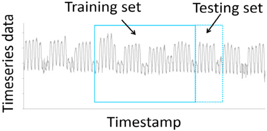 The number of data samples required in a testing set (i.e., the testing set size) is determined based on the forecast horizon of the model. For example, the testing set size for the week-ahead models is the number of hourly values in one week. The training set samples are taken from the preceding days of the testing set without gaps in between to ensure that the latest data are used for training. The training-testing sets are selected for cross-validation using a forward sliding window method as shown in Figure 4. The training-testing sets slide forward in steps equal to the size of the testing set. This also simulates the real-world operation of the ML models that we would want in deployment for DR capacity scheduling.