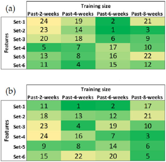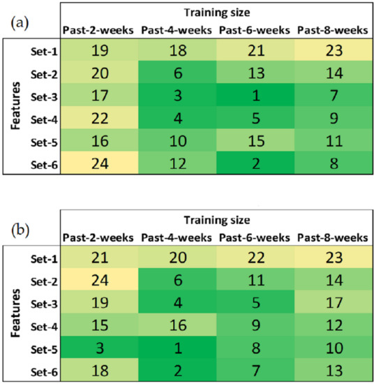 When all iterations over the six feature sets and four training sizes are complete, 24 candidate models are obtained for each building load forecast category (i.e., total load week-ahead, flexible load week-ahead, total load day-ahead and flexible load day-ahead). Based on their recorded average MAE values, relative model rankings are derived for each of these categories such that a model with the lowest recorded average MAE is given rank 1 and selected as the best candidate. The model rankings are displayed as heatmaps in Figure 5 and Figure 6.