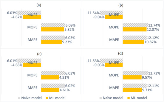 As mentioned in Section 2.4 on data preparation, 25% of all the global datasets are kept untouched for ML model evaluation. These datasets are used to simulate the operation of the best candidate ML models identified from the model selection process, in a production-like environment. Hence, model evaluation is also a pre-production test for the best candidate ML models where the training-forecasting process is simulated using the training-testing sets in the respective evaluation set (selected based on the forward sliding window method discussed in Section 2.4). For day-ahead models, this results in a continuous set of forecasts that are produced in daily steps based on the training data behind. Here, the training data size depends on that of the best candidate ML model. Similarly, for the week-ahead models, the forecasts are produced in weekly steps. These forecasts are then compared against the actual values and model performances are quantified using the error metrics, mean absolute percentage error (MAPE), mean overprediction percentage error (MOPE) and mean underprediction percentage error (MUPE), given below: