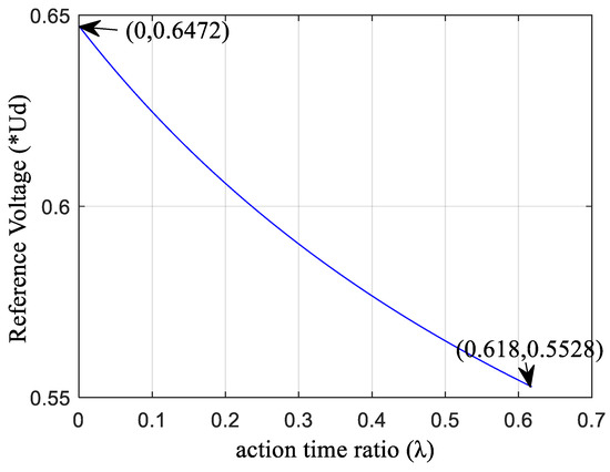 According to Equation (21), when Ud is constant, the reference voltage changes with λ; the relationship is shown in Figure 6. When λ = 0, the maximum reference voltage can be obtained, which is 0.6472Ud, and the corresponding modulation index is m = 1.231, in which only the two adjacent larger vectors work. When λ = 0.618, the reference voltage is 0.5527Ud and the corresponding modulation index is m = 1.0514, which means the two adjacent large vectors and the two middle vectors work together.