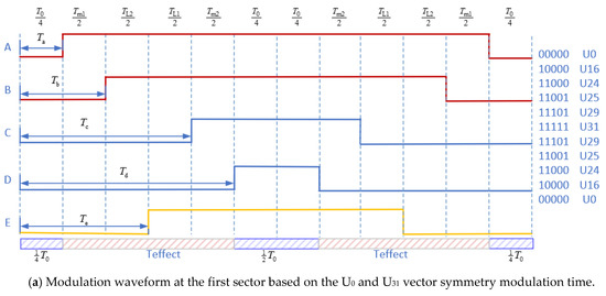The effective action time of the corresponding half cycle can be expressed as Equation (23). The action time of the zero vector (U0 and U31) in the half cycle is shown by Equation (24):