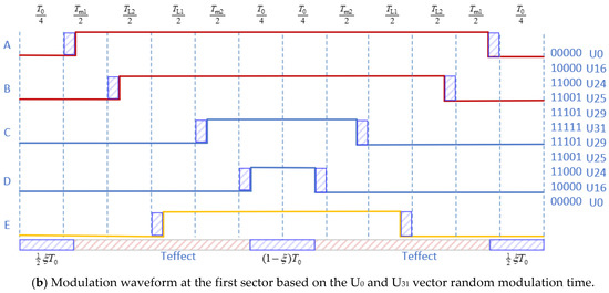 - Zero-vector action time randomizationThe zero-vector action time randomization was proposed because the MMF (magneto motive force) depends on the five-phase voltage vector action time difference and has nothing with the conduction time of the voltage vector. Zero-vector action time randomization, which can adjust the electromagnetic compatibility without additional hardware, was used to spread the harmonics concentrated around certain frequencies to a wider frequency band and produce a more continuous and uniform power spectrum. In order to keep Teffect, as defined in Equation (23), as a constant and to reduce the harmonic effect, zero-vector action time randomization was introduced.In Sector 1, for example, the principle of zero vector randomization is shown in Figure 8. Figure 8a shows the PWM symmetric modulation waveform adopting the traditional four-vector method, wherein the action time of the two zero vectors is equal. Figure 8b shows the PWM random modulation waveform, wherein the action time of the two zero vectors is random.