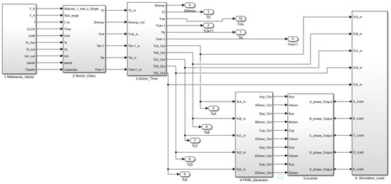 In order to test the proposed algorithm, a five-phase induction motor simulation model was built based on Matlab/Simulink, as shown in Figure 9. The simulation model mainly included a reference vector module, sector calculation module, action time module, PWM generator module, inverter module, and simulation load module. The motor parameters of the simulation model were consistent with the parameters of the actual induction motor as shown in Table 2. In order to verify the algorithm, two typical modulation indexes, m = 1.0514 and m = 1.1, were considered.