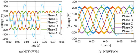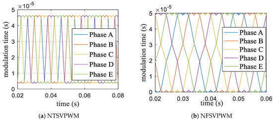 According to Figure 3, the nearest two-vector SVPWM algorithm (NTSVPWM), which is composed of two large vectors and two zero vectors adjacent to the reference vector, and the nearest four-vector SVPWM algorithm (NFSVPWM), which is composed of two large vectors, two medium vectors, and two zero vectors adjacent to the reference vector, are traditional algorithms used in the context of a five-phase motor based on the mature SVPWM symmetric modulation algorithm of the three-phase inverter.
