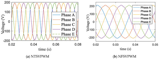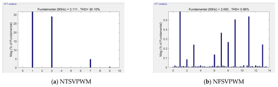 When the modulation index m = 1.0514, the modulation time waveform curves were as shown in Figure 10. Figure 10a shows the NTSVPWM algorithm and Figure 10b shows the NFSVPWM algorithm. The corresponding voltage curve of each phase is shown in Figure 11; the output voltage of each phase was far less than the DC bus voltage and the maximum DC-bus utilization rate was not reached using NTSVPWM, as shown in Figure 11a, although the output voltage of each phase could reach the DC-bus voltage with a short modulation time using NFSVPWM, as shown in Figure 11b. The corresponding harmonic chart is shown in Figure 12. The third harmonic was 28.9% and the seventh harmonic was 4.66% for NTSVPWM, as shown in Figure 12a, which shows that the harmonic component was relatively large. The third harmonic was 0.28% and the seventh harmonic was 0.35% for NFSVPWM, as shown in Figure 12b.