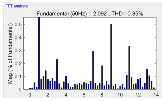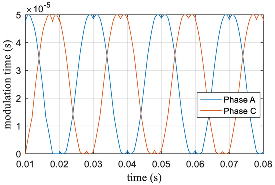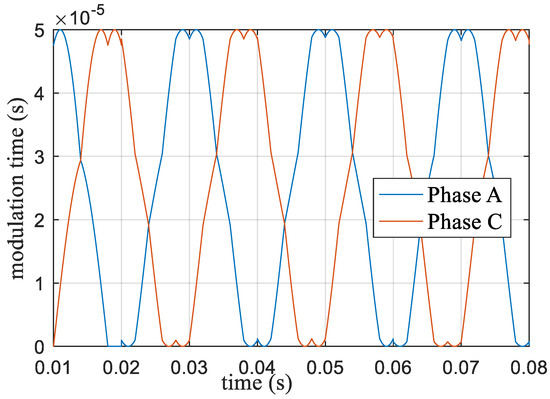 When the modulation index m = 1.0514, according to Equation (22), the modulation time ratio was the same as the amplitude ratio. Two large vectors, two middle vectors, and two zero vectors modulated dynamically. The corresponding modulation time waveform only phase A and phase C modulation time are shown in Figure 13. The corresponding output voltage of each phase is shown in Figure 14, where the output voltage reached the maximum DC bus utilization. Figure 15 shows the corresponding harmonics, where the third harmonic accounted for 0.21% and the seventh harmonic accounted for 0.25%. The third and seventh harmonics were reduced.