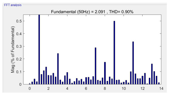 Figure 30 shows the experimental voltage waveform at m = 1.1, at which the dynamic modulation algorithm proposed in this paper was used. Figure 31 shows the harmonic characteristics, wherein the third harmonic accounted for 8.9% and the seventh harmonic accounted for 1.4%.