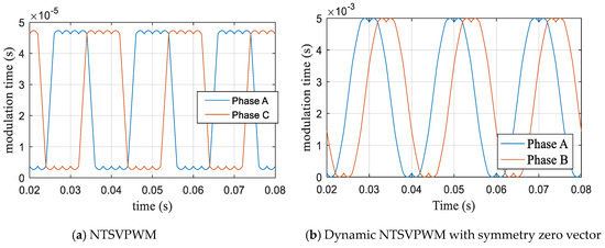 According to Equations (7) and (16), NFSVPWM has a lower modulation index than NTSVPWM but better characteristics. When m ≤ 1.0514, either NTSVPWM or NFSVPWM can be used, but NFSVPWM is the best according to [22,23,24]. When 1.0514 < m ≤ 1.231, the NFSVPWM algorithm cannot be used because of the longer action time of the middle space vector. The aim of this paper was to propose a new method dynamic modulation four-vector algorithm to improve DC bus utilization and reduce the harmonics.