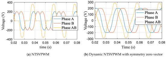 Because of the two following reasons [1,20], although the modulation index m = 1.231 is greater than m = 1.1547 (modulation index of the three-phase motor in the line range), m = 1.231 does not become the boundary of the linear and overmodulation regions.