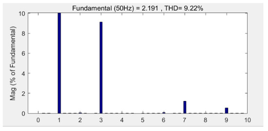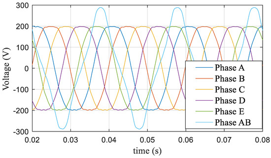When the modulation index m = 1.1, the action time ratio λ was determined according to Equation (22), and the modulation time curve was obtained as shown in Figure 19. The corresponding five-phase voltage and AB (AB = Phase A − Phased B) line voltage curves are shown in Figure 20, and the corresponding harmonic characteristics are shown in Figure 21. The third harmonic accounted for 8.9% and the seventh harmonic accounted for 1.2%.
