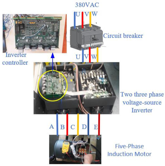 In order to verify the proposed algorithm, a five-phase prototype system was supplied by an inverter composed of two three-phase two-level voltage-source inverters sharing the same DC-link voltage, with each inverter phase leg operating independently. A STM32F407 high-performance microcontroller was used to control the inverter. Figure 22 shows the experimental system of the five-phase induction motor.