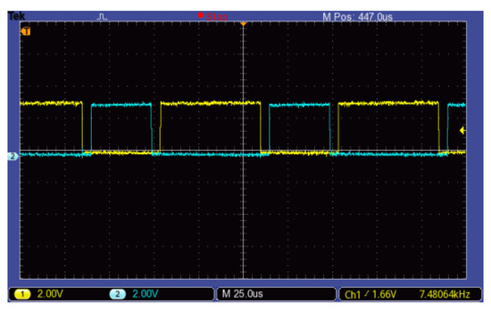Figure 23 shows the some-phase PWM (Pulse Width Modulation) control waveform. The PWM frequency was 10 kHz in this experiment. When the electrical characteristics of the IGBT inverter were considered, a 5-us dead band was set taking into account the inverter manufacturer’s suggestion to form a complementary control waveform of the upper and lower bridge, thus avoiding inverter burn because the upper and lower bridge are connected at the same time. In order to avoid the influence of the dead band on the inverter output voltage, voltage feedback compensation was taken into account.