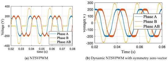 When the modulation index m = 1.1, the NTSVPWM and dynamic NFSVPWM with a symmetry zero vector were used to obtain the phase action time waveform, as shown in Figure 16. The corresponding output voltage is shown in Figure 17, and the corresponding harmonic characteristics are shown in Figure 18. The third harmonic accounted for 28.9%, and the seventh harmonic accounted for 4.66% for NTSVPWM as shown Figure 18a. The third harmonic accounted for 9.127%, and the seventh harmonic accounted for 1.215% for the dynamic NFSVPWM with a symmetry zero vector as shown Figure 18b.