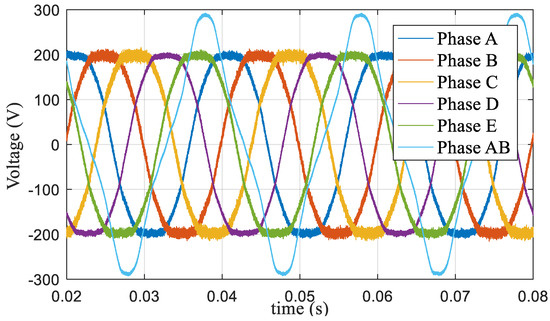 Five-phase voltage and AB (AB = Phase A − Phase B) line voltage at m = 1.1.