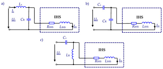 Resonant inverters are currently the dominant group of power sources in industrial induction heating technologies. They realize the energy conversion from the electrical to thermal form through high frequency electromagnetic field generation, which penetrates a heated charge. The use of Insulated Gate Bipolar Transistor (IGBT) and Metal-Oxide Semiconductor Field-Effect Transistors (MOSFET) allows the implementation of sources with both high powers exceeding 1 MW and high frequencies over 500 kHz [1,2]. Current or voltage inverters may be used, although the latter are more common in practice, for reasons that are both structural (including easier control) and technological. A typical topology for resonant voltage inverters used in induction heating systems (IHS) is based on a second order LC series resonant system, in which the IHS is an essential part of the inductance and resistance of the resonance circuit. Although they have a number of advantages, resonant sources also cause the changes in the electrical parameters of the IHS (resistance RIHS and inductance LIHS) to affect the operation of the source. As well as changing the frequency, this may also worsen energy matching, reducing optimal usage of the power potentially available from the source. Changing the type of IHS can cause up to several hundred-fold differences in the RIHS resistance or LIHS inductance. However, in industrial practice a given power source is usually loaded with an IHS that has similar electrical parameters, especially the RIHS resistance value, which does not typically differ by more than around tenfold. During the induction heating process itself, several-fold changes in the IHS electrical parameters may also be observed, in comparison to the values for a “cold” charge [3]. In various technical solutions, LC-type oscillation systems can be used for various purposes, as now in triboelectric nanogenerators to boost the performance of transferring energy to a storage unit [4,5]. In induction heating generators matching transformers are now often supported by complex passive systems, which together with IHS create resonance systems mainly of the third [6,7,8,9,10] and fourth [11,12] orders, allowing for an additional effect of impedance transformation. Figure 1 presents three basic solutions for third-order LLC, CLC, and CLL resonance systems found in the literature.