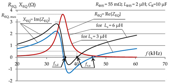 In the LLC system, the resonance state can potentially occur at two different values of the resonance frequency fr for which the complex equivalent impedance of the resonance system has only the real part, equal to a certain equivalent resonance resistance REQ. The resonant state is strongly required as it assures the optimal energy conversion. Using Equation (1), Figure 2 shows an example (for two values of series inductance Ls = 3 μH and Ls = 6 μH) of the frequency influence on both the equivalent resistance REQ(f) and the equivalent reactance XEQ(f) = ω LEQ(f) of the LLC system. The values for the other elements of the system are assumed to be CR = 10 μF, RIHS = 55 mΩ, and LIHS = 2 μH. As can be seen in Figure 2, by changing the operating frequency it is possible to change the value of the REQ(f) resistance within a very wide range, for a constant value of RIHS resistance. This can be interpreted as a frequency-dependent resistance transformation ratio (matching ratio) . Resonance systems, especially of a higher order such as LLC, can therefore perform the function of transforming the resistance value, with the transformation coefficient pR(f) being a function of the operating frequency.