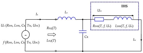 The functionality of the LLC system (as an example of a higher-order resonance system) can be used in an energy matching system to transform RIHS resistance to REQ resistance. However, the degree of this transformation pR(f) depends on the frequency f, and in the case of induction heating this frequency depends on the change in the inductance LIHS, caused by heating the charge (especially a ferromagnetic charge). For this reason, it is reasonable to consider how in this type of resonance system changes in the IHS parameters (caused by the heating process and changes the temperature T of charge) may affect the resonance resistance REQ(T) of the whole system, and whether the LLC system stabilizes or strengthens such changes in resistance in comparison to the typical (second order) series or parallel resonance systems. This issue requires the analysis of the interaction of the source and load, because changes in both output parameters of the inverter (frequency f and voltage Uz, Figure 1) affect the process of heating the charge, while heating the charge (changing RIHS(T) and LIHS(T)) affects the work of the resonant inverter. This is a complex issue, as the heating process in itself is additionally a coupled electromagnetic–thermal field problem. Computer simulation of this issue requires a combination of coupled field calculations with circuit calculations. Such calculations are made much easier if the electromagnetic field can be treated as a harmonic field.