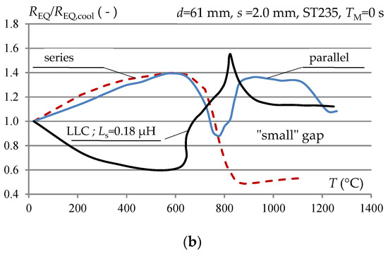 Figure 7 compares the changes in REQ as a function of temperature at the midpoint P of the charge (Figure 5), for each of the three resonance systems on a relative scale in relation to the resistance REQ, cool that was found for the “cold” state of the charge. The relative changes in REQ are usually different in nature in the LLC system compared to the systems with serial or parallel resonance, but the range of changes may be larger or smaller. It can be concluded that from the point of view of energy matching this system is neutral in comparison to basic systems with serial or parallel resonance.