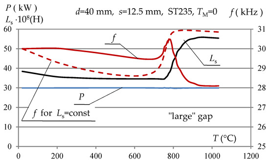 As shown in Figure 8, the changes in inductance Ls required to maintain a constant equivalent resonance resistance REQ (constant power P) did not exceed 50% of the initial value. Such a range of choke inductance changes did not constitute a technical limitation of its feasibility. The changes in resonance frequency f also did not differ significantly from the natural changes (Figure 8) in the resonance frequency during the process of heating the charge.