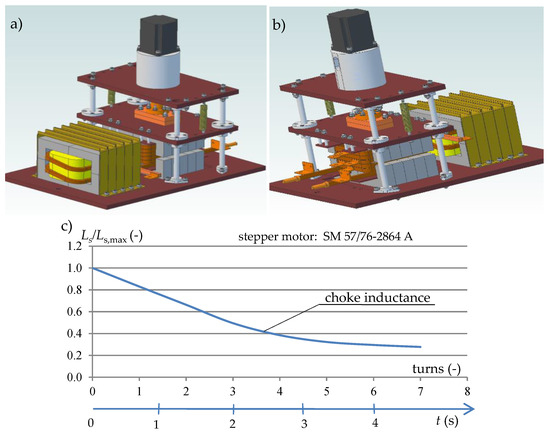 Structural model of the magnetic assembly with a stepper motor: (a) view from the transformer side, (b) view from the choke side, and (c) choke inductance change as a function of stepper motor turns.