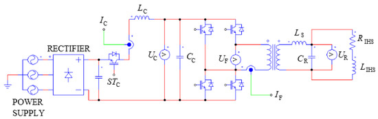 Diagram of the high-current part of a bridge-type voltage inverter with serial resonance cooperating with an induction heating system (IHS).