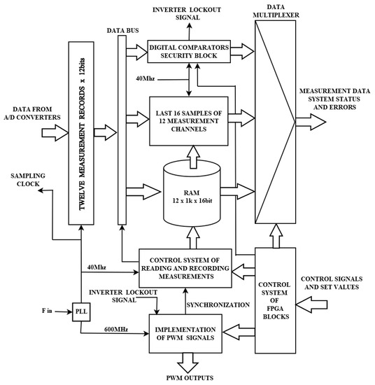 The executive system consists of three inverter blocks, the matching system, and a power supply. A fast Infineon processor based on the ARM Cortex-M4 core performs the tasks of the control algorithm, exchanging information with the master computer system, the I/O module system, and the programmable logic system. It also controls the inverter valves and stepper motors that regulate the inductance Ls values. The need for simultaneous measurement and the processing of many analog signals (such as output voltage, output current, and intermediate circuit current, as well as the resonant capacitor voltage) in real time creates serious challenges for each of the inverter blocks. Most of the measured signals are AC signals, which require a high sampling frequency and the collection of large amounts of data. Therefore, this function is implemented by means of an FPGA programmable logic system (Figure 12), using analog-to-digital converters with a sampling frequency of 40 MHz. The FPGA also implements procedures responsible for fast PWM outputs, which control the voltage inverters in a wide frequency range. The internal PLL system, the programmable structure of which enables the implementation of a fill factor with a time step of 1.66 ns, allows for smooth setting of the inverter frequency. The PLL system also provides rapid handling of errors and protects the inverter valves from exceeding the range of acceptable values for signals.