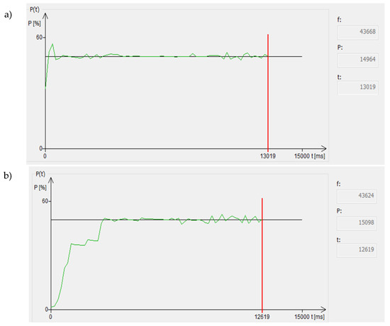 Visualization of the generator power waveform during the heating process: (a) with the initial load identification procedure and (b) with a starting frequency that differs by 5% from that established in the load identification procedure.