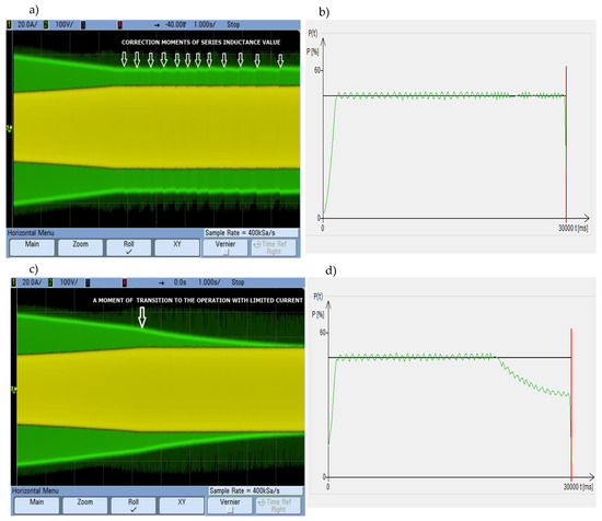 Current, output voltage and power waveforms for one module of the generator inverter during the heating process: (a,b) with Ls the change procedure enabled and (c,d) without changing the Ls settings.