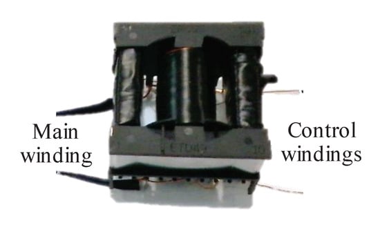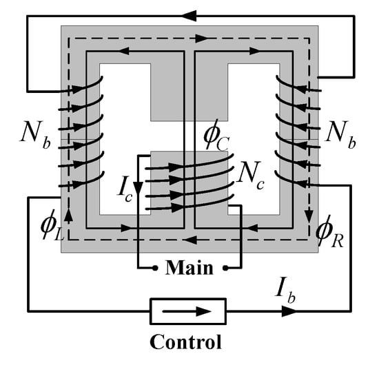 Due to the current () flowing through the main winding () of the inductor, as clarified in Figure 1, an AC flux () circulates through the center arm of the typical E-core structure of the magnetic core and splits to the outer arms. Applying a relatively small DC current () to the bias control windings (), a DC flux ( or ) is produced, which circulates mainly through the outer (ungapped) closed path of the core [14]. This DC flux can bias the operation of the magnetic material towards the nonlinear region on the curve, thus causing the inductance seen from the main winding terminals to vary as a function of the DC bias current, Equation (1).