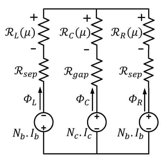 The voltage sources in the circuit represent the magnetomotive forces due to the bias control windings (), as well as the main winding (). is a constant reluctance that represents the air gap, while is a constant reluctance that represents the air separation between the two E-cores due to non-idealities in the manufacturing process. The components , , and are the reluctances of the magnetic paths of the left, center, and right arms, respectively. These reluctance values are represented as a function of the permeability of the magnetic material (), and it must be noticed that, unlike the usual case, in variable magnetic elements, these permeability values can vary depending on the operation point of the magnetic core material on the characteristic curve. Thus, for calculating these reluctances, the referred model uses Brauer’s equation [16], which defines the characteristic curve of the magnetic material neglecting the hysteresis effect, as stated by Equation (2).