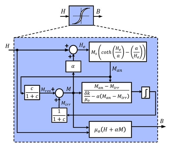 Figure 3 shows a block diagram of the detailed implementation of the JA equations [22]. Following this block diagram, the model equations have been implemented in Simulink®. Therefore, for a given core size and magnetic material, the instantaneous magnetic flux density (B) can be estimated for a certain instantaneous magnetic field intensity (H) applied to the magnetic core.