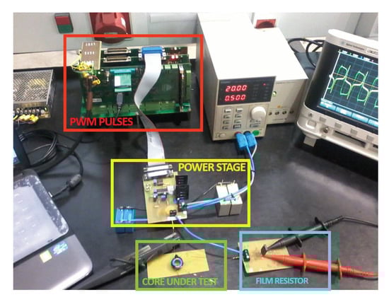Figure 4 illustrates a schematic to clarify the test setup used for measuring the core losses, while Figure 5 shows the experimental platform developed.