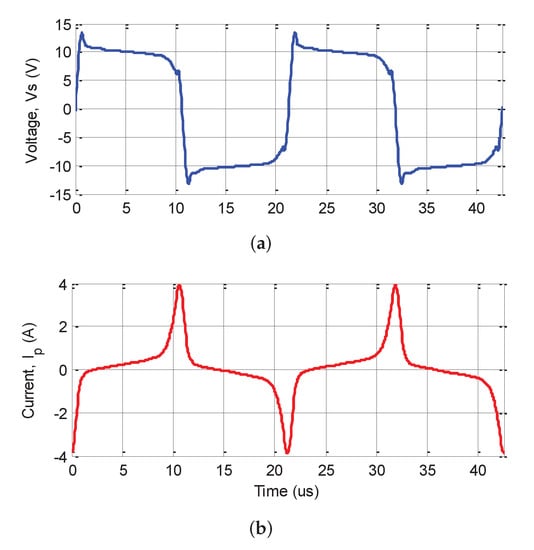 Experimental measurements. (a) Voltage applied to the toroid, and (b) current flowing through the main winding.