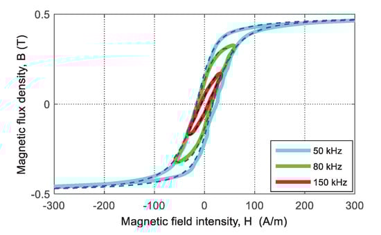 To test the validity of the obtained expressions for the JA parameters as a function of frequency, several experiments were carried out using the N87 toroidal core described in Table 2. The switching frequency of the converter was changed and the curves corresponding to different frequency values were measured and compared to the modeled ones, as illustrated in Figure 8. The results of the comparison show that the modeled curves match the obtained experimental measured curves at a wide range of the operation frequency with acceptable accuracy.