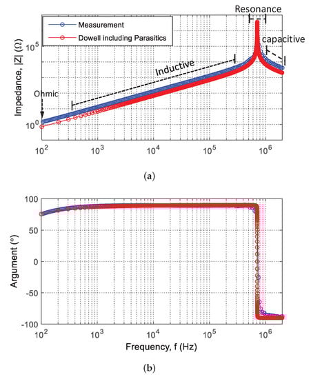 where and are coefficients defined based on the geometrical dimensions of the winding, material characteristics, and frequency of operation, and m is the number of layers. The accuracy of the full winding model will be provided in the following sections to assess the validity of using Dowell’s method for the application herein.