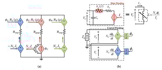 Figure 12a illustrates the magnetic system, which is represented by the reluctance equivalent circuit of the device. The reluctance equivalent circuit is composed of three branches. The left and right branches represent the magnetic circuits of the control arms of the device. The voltage source () models the magnetomotive force created by each control winding. The voltage sources () and () model the variable reluctance of the magnetic path of the right and left arms, respectively. Using the control current as the input quantity, the values of the variable voltage sources are calculated based on the JA hysteresis model. The middle branch represents the magnetic circuit of the main arm, the variable reluctance of the magnetic path is similarly represented by the voltage source (), while in this case, the magnetomotive force is the output quantity and is represented by a current source. The current in the main winding () can, thus, be calculated by measuring the voltage across this current source and dividing by the number of turns of the winding ().
