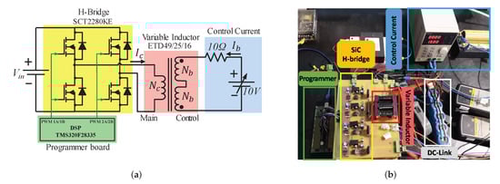 Figure 14a shows a circuit diagram of the developed test platform. It consists of a SiC full-bridge DC-AC converter to apply a square waveform excitation voltage on the inductor main winding. As mentioned previously, the square waveform voltage allows testing the device model under non-sinusoidal conditions, thus assure the validation of the loss study under a general condition of excitation voltage. The converter is controlled using a TMS320F28335 Texas Instruments peripheral board. Additionally, a variable DC voltage source is connected in series with a resistor to provide a DC control current of maximum 1 A to the control winding of the variable inductor. The constructed test platform is illustrated in Figure 14b.