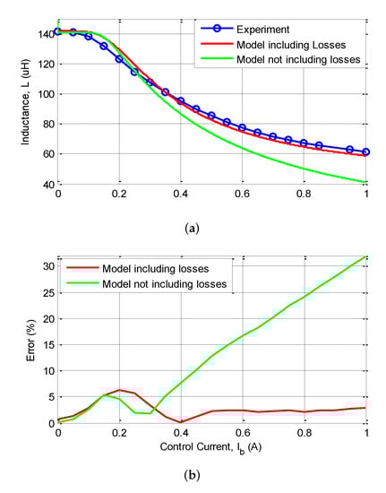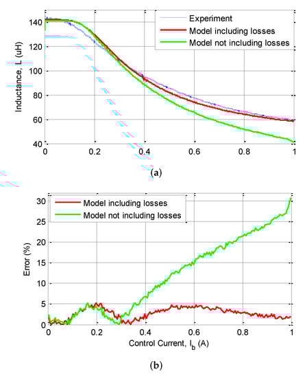 To validate the proposed model under small-signal analysis, the control current was increased from 0 to 1 A in steps of 0.05 A, while keeping zero excitation voltage on the main winding. The equivalent inductance seen from the main winding was measured using the impedance analyzer. Figure 15a illustrates the measurement of the equivalent inductance as a function of the bias control current. Also, the figure illustrates the simulated inductance obtained from the developed models, the initial lossless equivalent circuit, as well as the proposed model, which includes losses. Figure 15b shows the error of each model compared to the experimental results, as calculated by Equation (22). It can be observed that the proposed model that includes losses predicts the inductance within an acceptable error (<6%). On the other hand, the inductance predicted by the initial lossless model shows a clear deviation from the experimental one as the control current increases. It reaches an error of 30% at maximum control current.