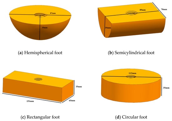 Four kinds of mechanical feet (Figure 1), the hemispherical foot, the semicylindrical foot, the rectangular foot and the circular foot, respectively, were designed and manufactured based on the existing foot morphology of most bipedal robots. The thickness of each mechanical foot was 35 mm, and the plantar surface area was 9815 mm2.