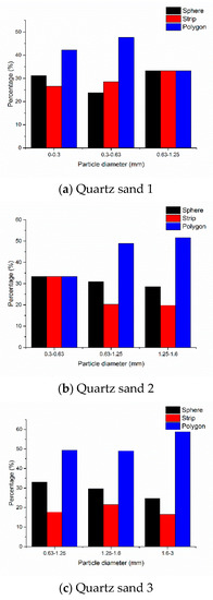 The particles were divided by the characteristics of structure and contours into three typical shapes: sphere, strip and polygon. Each shape of particle with a different size was statistically analyzed (Figure 3). Clearly, polygonal particles account for a large proportion of the total under different particle sizes, which also indicates the irregularity of quartz sand shapes.