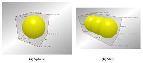 Based on the statistical analysis of particle shapes, three kinds of particles (sphere, strip and polygon) were identified. Among them, the strip and polygon particles were both assembled from regular spherical particles. The three typical particle shapes 0.63–1.25 mm in diameter in quartz sand 3 are shown in Figure 6. These three typical shapes were also used for other particles with different sizes in quartz sand 3 and the other two kinds of quartz sand. The size of the modeled particles was changed according to the actual particle size.