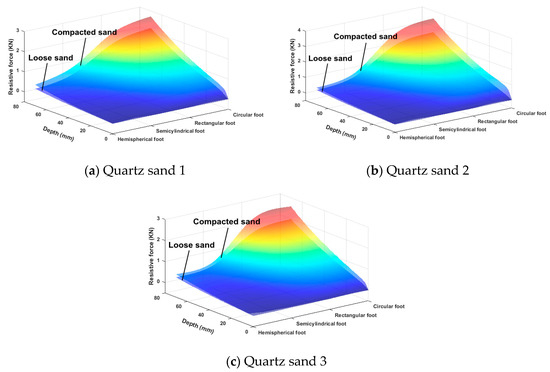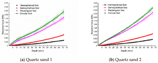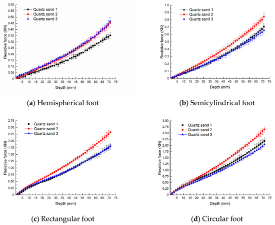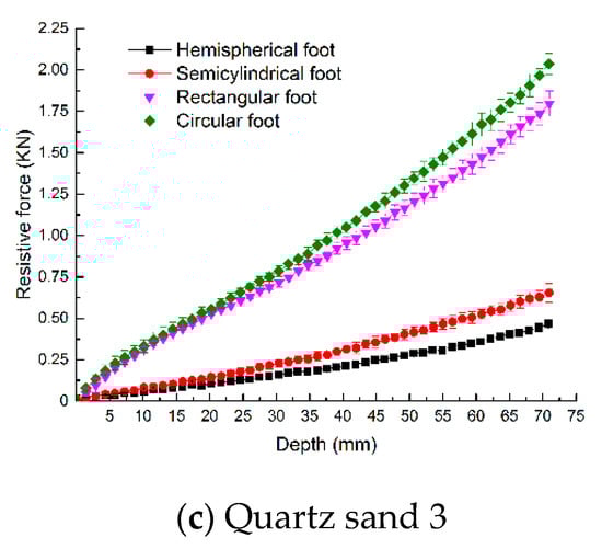 The intrusion resistive forces of the mechanical feet intruded into loose quartz sand 1, quartz sand 2 and quartz sand 3 are shown in Figure 7a–c, respectively. The intrusion resistive force of the hemispherical foot on loose quartz sand 1 was less than that of the other three mechanical feet. The intrusion resistive forces of the mechanical feet on loose quartz sand 2 and quartz sand 3 followed the same trend.
