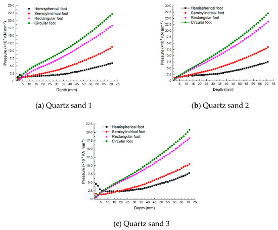 The comparisons of intrusion pressures for different mechanical feet are shown in Figure 8. At the initial stage of intrusion, the pressures of the mechanical feet slightly increased, then decreased and steadily increased with the increasing depth, especially for the hemispherical foot on loose quartz sand 3. The reason for this phenomenon may be attributed to both the changes in foot intrusion cross–sectional area and the inertia characteristics of quartz sand. Then, at the stable stage of intrusion, the pressure of the hemispherical foot was less than that of the other three mechanical feet, regardless of the type of sand, which was the same for the resistive force.